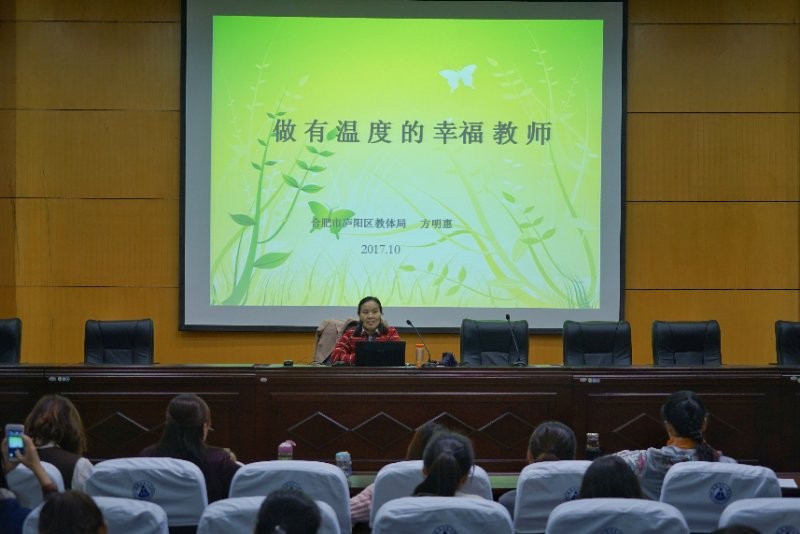 下午,来自合肥市庐阳区教育局的教研员方明惠用深入浅出的语言为大家带来了一场“接地气”的讲座《做有温度的幸福教师》,她在讲座中如是说到:“我们不要做变色龙,而要做一个有感染力、有亲和力、有责任心的教师,让孩子感受到温暖,从而舒展开来。”她还为大家介绍了大量案例,让大家感悟幸福瞬间,将幸福驿站停留在彼此的心间。