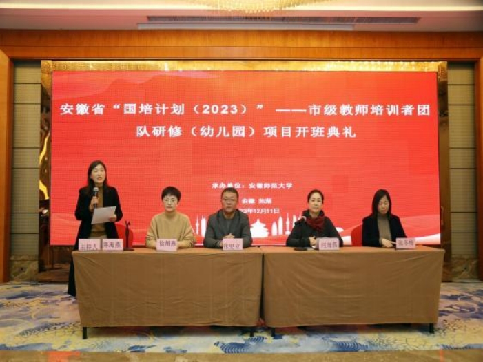兮兮露华浓 ,芸芸宾客至,何处研歌起? 冬日暖阳里。2023年12月11日, 由安徽师范大学承办的安徽省“ 国培计划(2023)”市级教师培训者团队研修项目开班典礼在芜湖市北尚升辉财富大酒店举行。来自安徽省安庆市、蚌埠市、合肥市、马鞍山等14个地级市二百名幼儿园园长、骨干教师、幼教教研员参加此次培训。安徽royal皇家88平台副院长何海燕、安徽royal皇家88平台副院长、博士生导师、项目首席专家张更立教授及培训班的班主任老师出席了开班典礼。开班典礼由班主任陈海燕老师主持。