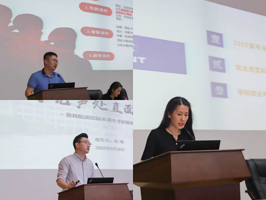 研究生辅导员谭茹轩从就业现状、就业类型与签约方式、学院就业帮扶措施等三个方面汇报了2022届研究生就业情况。本科生辅导员莫大贡向与会同学介绍了征兵入伍、基层就业项目、考编与考公、就业服务等相关政策。本科生辅导员程啸介绍了学院2022届本科生考研情况,鼓励考研学子要明确自身定位,合理选择奋斗方向。