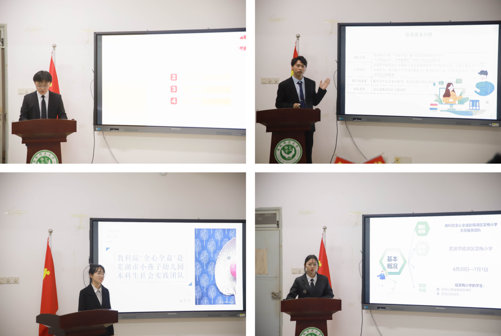 答辩会分为上、下半场,43位队伍代表根据抽签顺序依次上台,围绕团队的基本概况、实践准备、活动组织、经费预算等方面进行三分钟汇报。今年组建的43支队伍,既有传承了10年的和县爱心支教团队,也有各团队自行对接的新实践基地,实践内容涵盖了爱心支教、心理辅导、教育调研、理论宣讲、生涯体验等不同方面,内容丰富,各具特色。