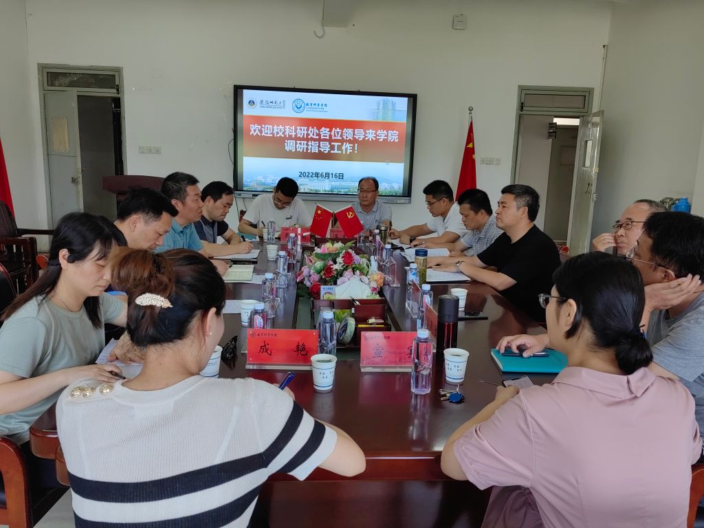 6月16日下午,校科研处处长徐彬,副处长王朝辉、杨如意及相关科室负责人深入学院调研指导,李宜江、周兴国、宣宾、聂竹明、张更立、吴支奎、吴文涛等参会,会议在学院308会议室召开。