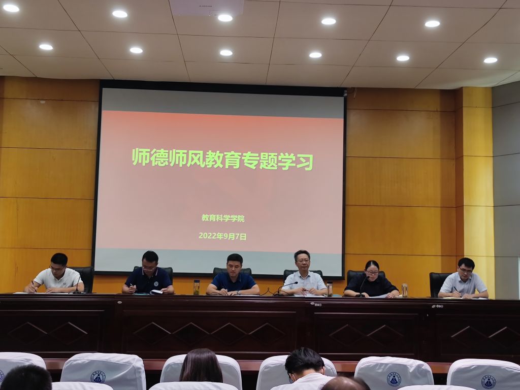 9月7日下午,教育科学学院组织全体教工在赭山校区田楼报告厅开展师德师风警示教育专题学习,会议由学院党委书记方泓主持。