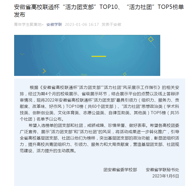 为贯彻落实《高校共青团改革实施方案》文件精神,深入实施高校基层团支部“活力提升”工程,团中央于2022年秋季学期开展高校“活力团支部”创建遴选活动。2019级学前教育专业1班团支部经过校级评选推荐、校级展示、省级展示、网络投票和答辩评审等环节,于近日在全省高校团支部中脱颖而出,获评2022年度安徽省高校“活力团支部”最具改革味荣誉称号。