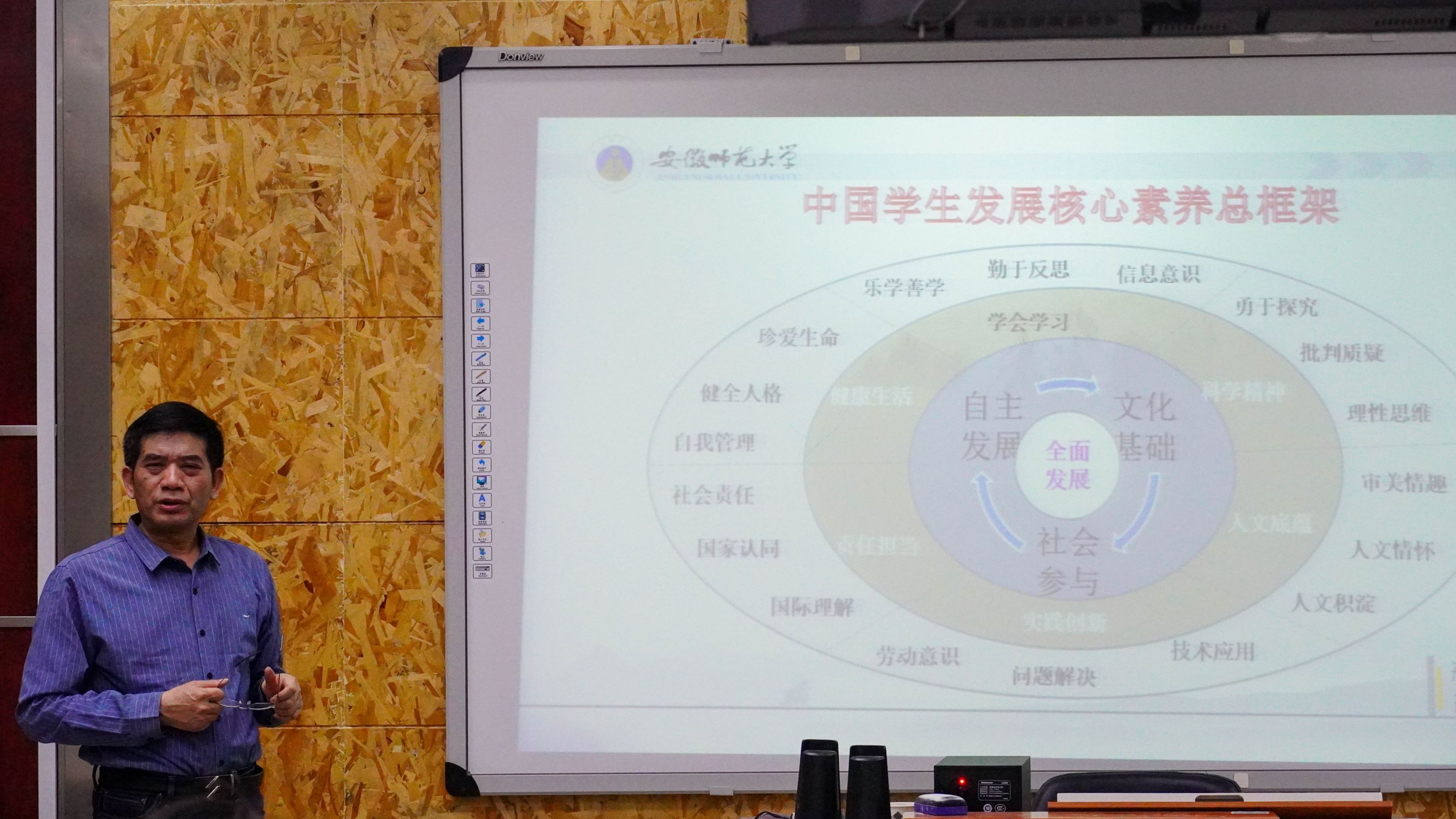 张新明结合自身工作研究方向,讲解了智慧教育下的教学新模式。他分享了《中国学生发展核心素养》的具体内容,提出在未来的教学中,课堂将会演变成互联网+课堂新模式。他以合肥168玫瑰园学校为例,带领学生们了解教育新形势下的改革方案和具体成果。他指出在智慧教育的模式下,学生应该个性化地学,教师应该个性化地教。随后,张新明对同学们的疑问一一做出解答。