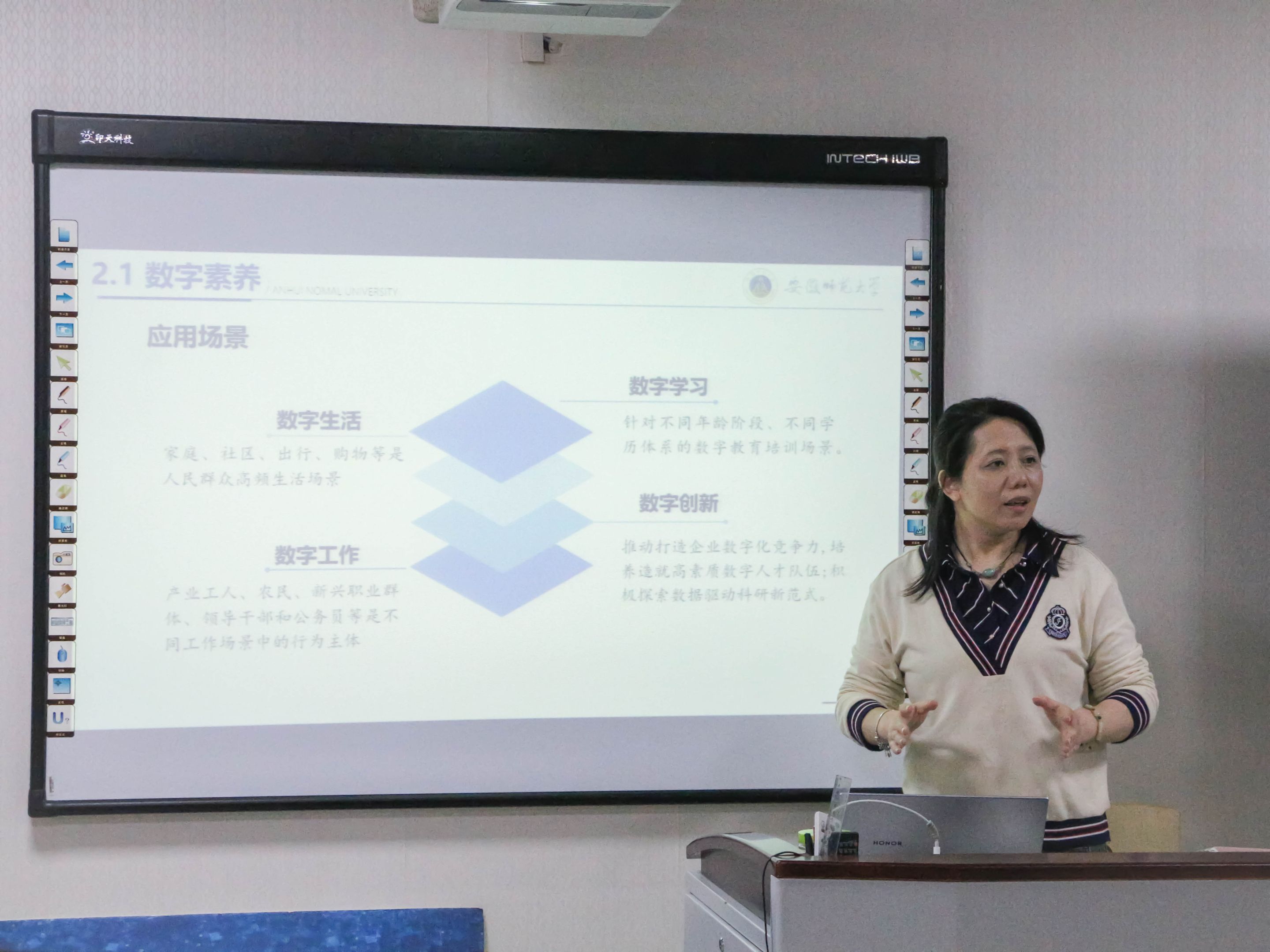 陶佳结合自身工作研究方向,分享了《提升全民数字素养与技能行动纲要》的具体内容,指出数字素养是公民立足于数字时代的根基。为适应数字化时代发展要求,加快提升大学生数字素养,既是全面提高新时代人才培养质量的要求,也是培养新时代堪当民族复兴大任时代新人的需要。她从数字素养与数字能力的内生逻辑切入,提出数字素养映射数字能力。针对数字化转型背景下特别是师范生数字能力培养,她分别从教学赋智、竞赛赋值、活动赋能三个方面分析了数字能力提升的实现路向。分享结束后,陶佳对同学们的疑问一一做出了解答,并鼓励大家主动、积极适应数字化发展趋势,通过多措并举,促进自身数字素养和数字能力的发展。