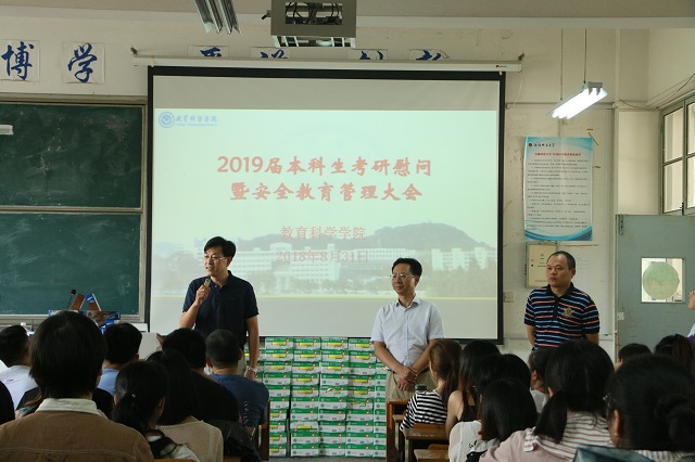 莫大贡老师报告了2019届毕业班学生考研意向统计的情况,通过数据分析了2016年至2018年考研报考及录取人数、比例和学院近年来的考研录取情况。他鼓励同学们即使考研的形势越来越严峻,希望同学们不仅看到挑战也要看到希望,坚定考研信心。