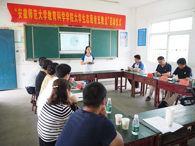 在全面了解团队的志愿服务活动之后,毕校长一行出席了“安徽royal皇家88平台大学生志愿者支教点”的启动仪式。副县长王竹梅代表当地政府对安师大学生们每年暑假的志愿活动表示感谢。她介绍了和县当地的教育现状和留守儿童的特点,对后期和安师大的支教活动合作表示期待和支持。志愿者代表王晨旭和祁欣分别从团队和个人的角度总结了自己的支教心得和感受,对社会和学校的各方面支持表示感谢。毕校长从感谢、慰问、调研三个关键词展开,阐释了本次慰问的意义。他对实践团队提出了三点要求:一是打造成素质教育的集合地;二是打造成社会实践的接续站;三是打造成留守儿童的希望港。随后,院党委书记方泓与副县长王竹梅共同为“安徽royal皇家88平台大学生志愿者支教点”揭牌。