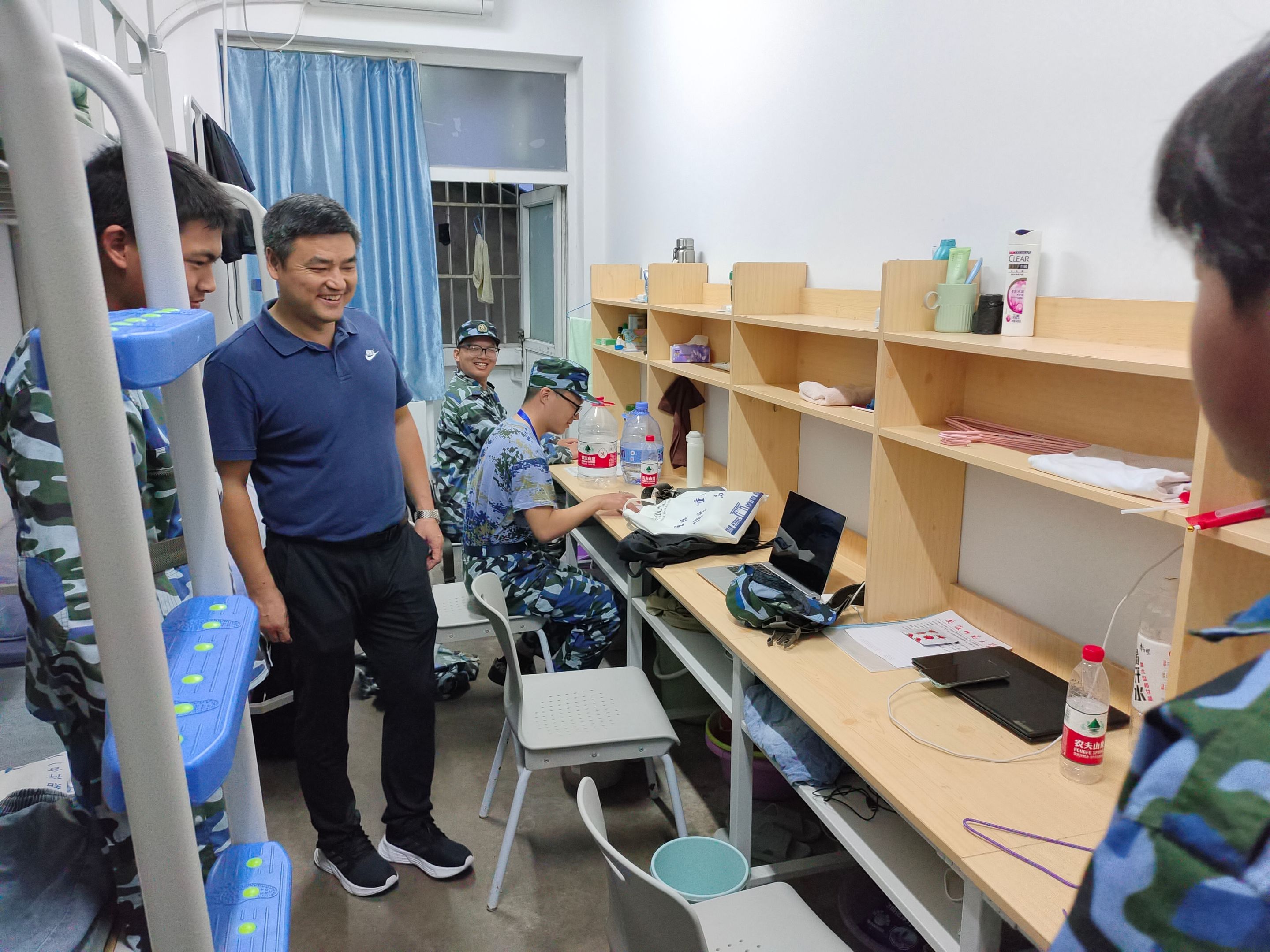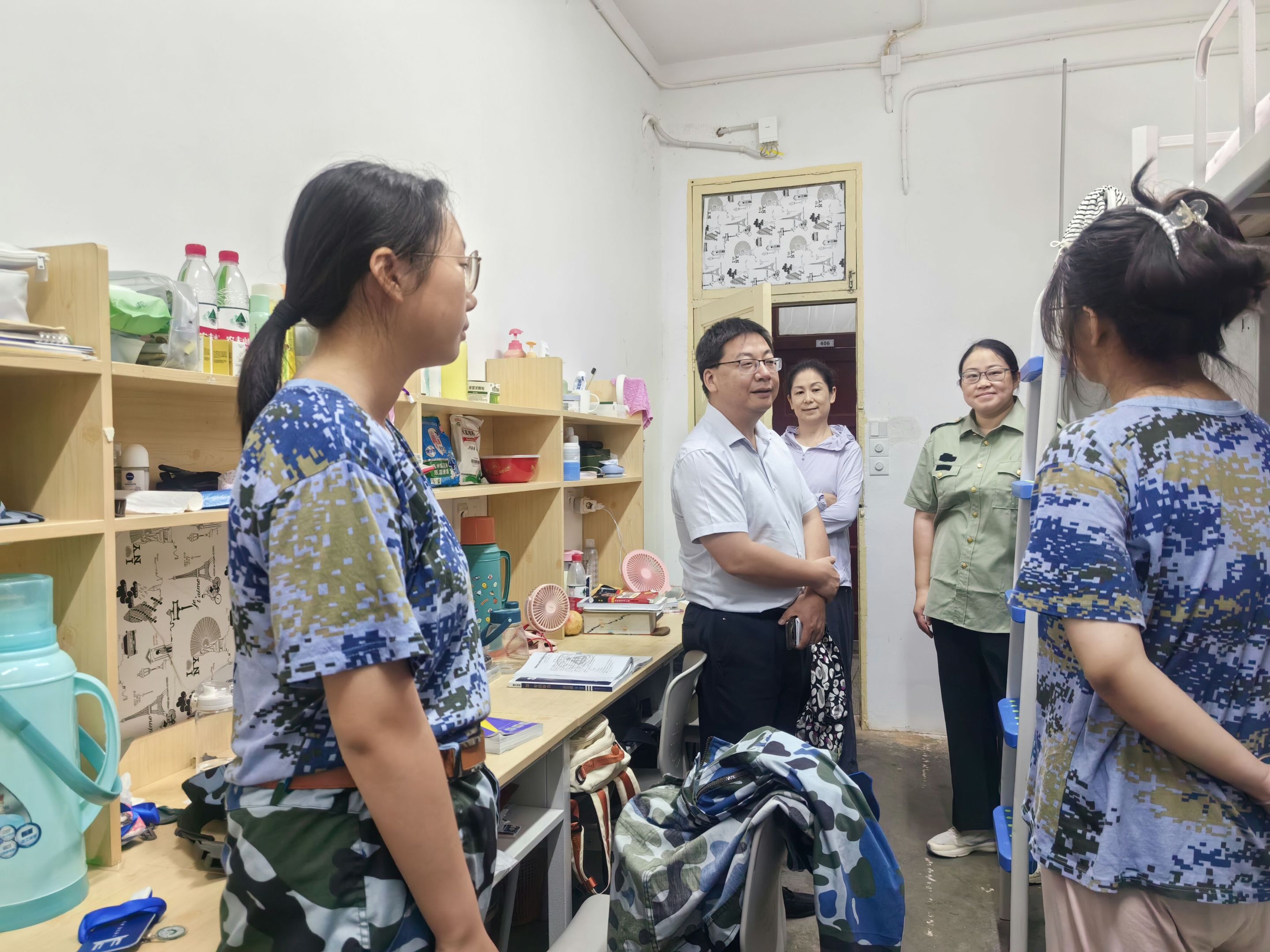院领导班子及辅导员深入学生宿舍,了解新生生活情况,询问军训适应状态,亲切与学生沟通交流。学院领导还就宿舍安全、校园安全、人身安全提出注意事项,督促学生保持军训内务教学成果,营造良好寝室氛围,共同打造寝室文化特色。