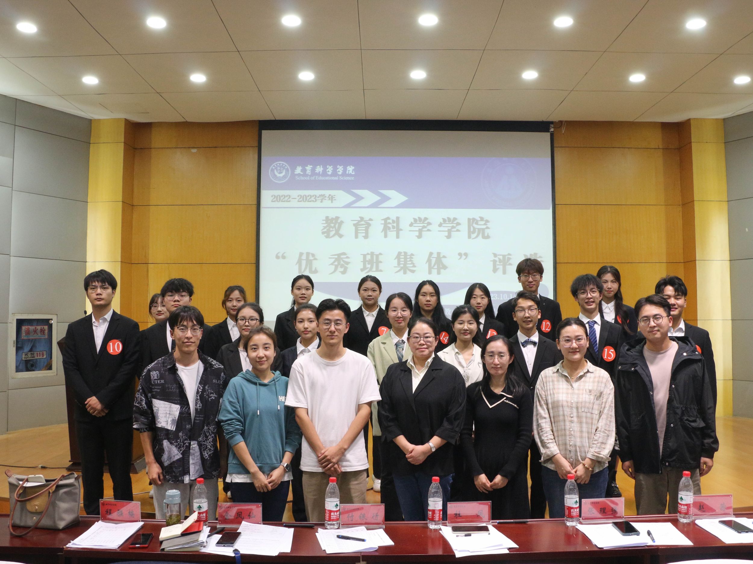 2023年10月14日下午,教育科学学院于田家炳教育书院3楼报告厅开展“教育科学学院优秀班集体”评选活动。院党委副书记杜凤、院团委书记付银行、院团委老师张理强、2021级辅导员赵茜、2022级辅导员程雅楠、2023级辅导员金凤仙、刘玉瑾以及各班汇报人及学生代表参加。