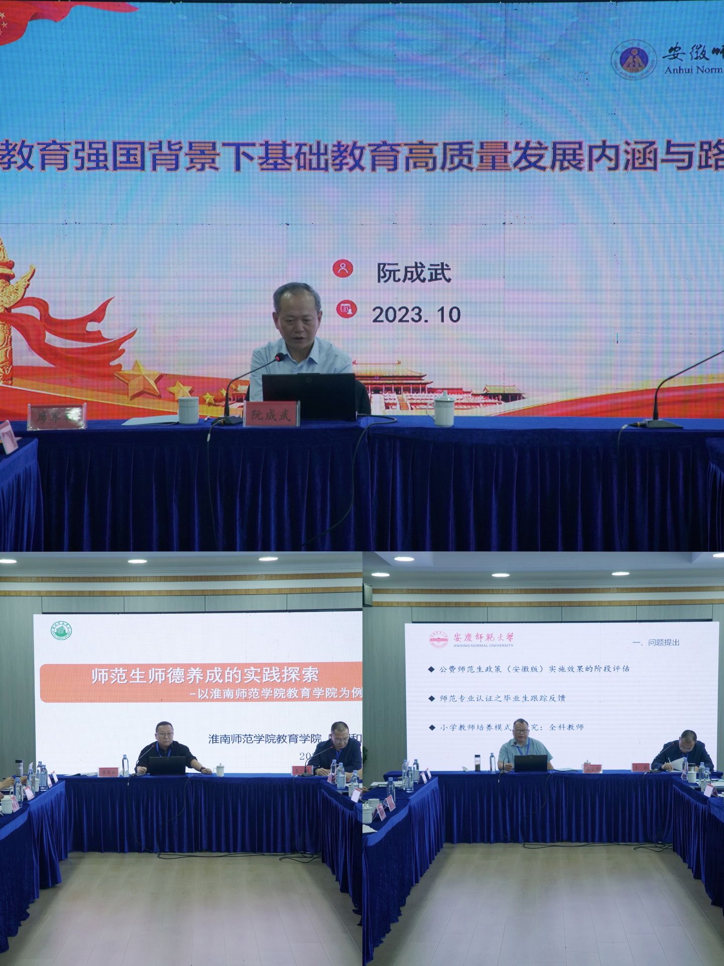 会议围绕“教育强国背景下乡村小学教师培养的时代诉求和实践路径”主题,分设主旨报告和圆桌研讨两个专题。主旨报告中,阮成武以“教育强国背景下基础教育高质量发展内涵与路径”为主题就中国式现代化强国建设的现实基础、中国式教育强国建设的目标图景、基础教育高质量发展支撑教育强国建设的内涵和路径等问题进行了专题报告,引发参会人员广泛而深入地研讨;淮南师范学院教育学院院长廖军和教授就淮南师范学院师范生师德养成的实践探索进行了报告交流,为教育强国背景下师范生师德养成实践提供了经验借鉴;安庆师范大学教师教育学院吴云助院长基于乡村小学全科教师职业发展的调查,就如何增强安徽定向培养小学全科教师入职适应性问题进行了探讨报告。