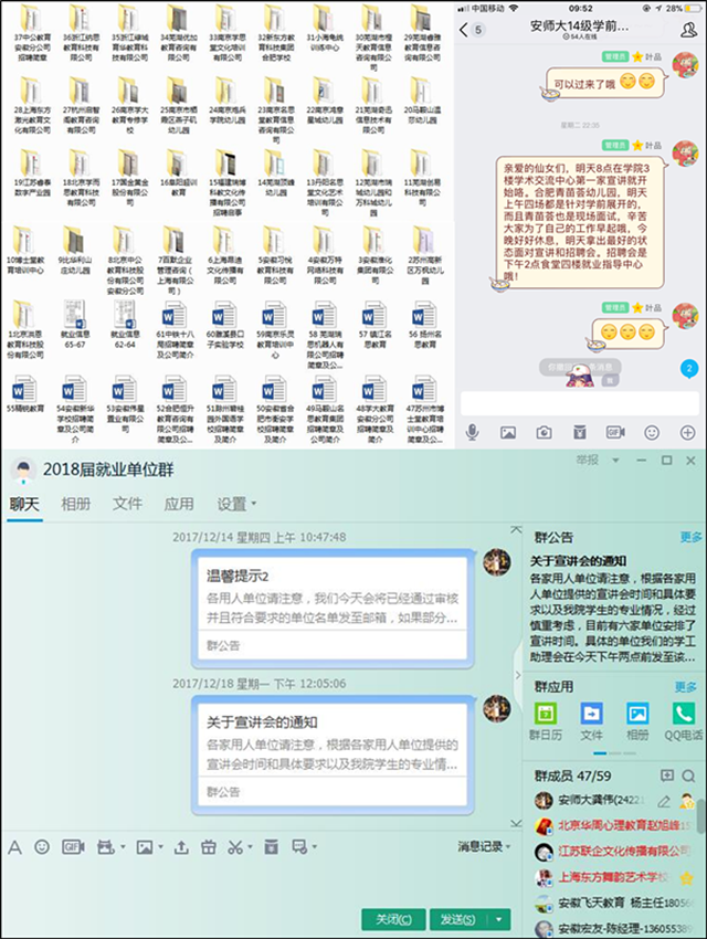 本次招聘会的成功开展,前后准备了一个月时间,以保研同学和党员同学为主,专门成立就业帮扶小组,对接用人单位、联系各专业学生、制作招聘会材料,投入了极大的精力,截止目前已发布近150余条信息,配套举办了包括上海精锐教育、镇江学思堂教育、国家彩虹工程阜阳技师学院、苏州亚瑟外国语学校等11场专场招聘宣讲会,得到了用人单位的一致认可,也获得了毕业生的一致满意。