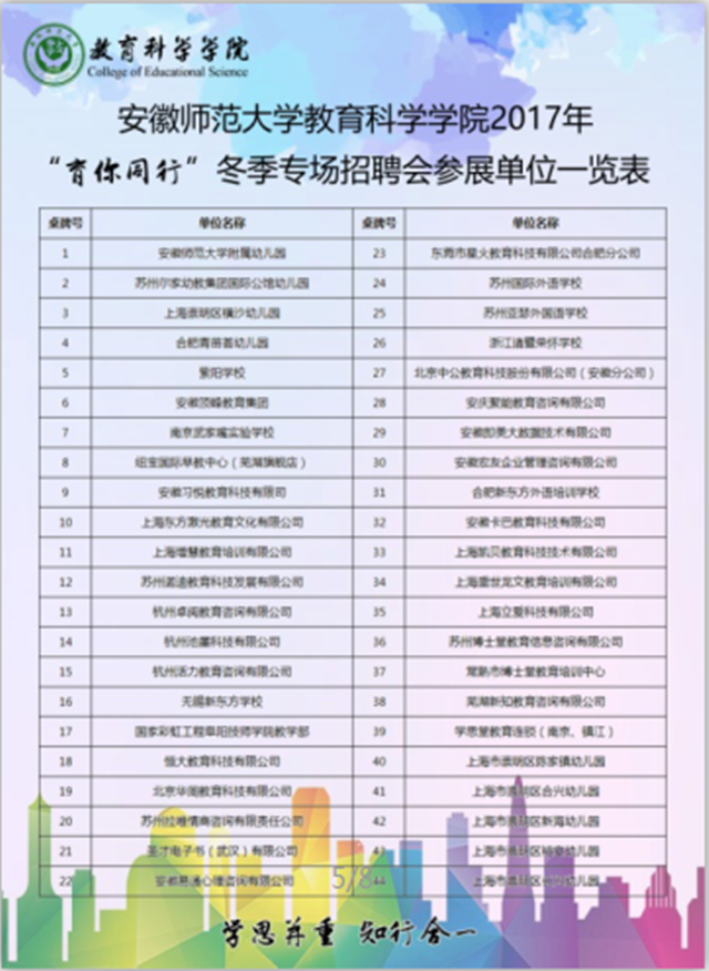 本网讯(教科院 龚伟)把握就业黄金期,服务学子好时机。为全力做好2018届毕业生就业工作,搭建毕业生与用人单位交流“直通车”,1227日下午教科院举行了学院第四届“育你同行”校园冬季专场招聘会。上海崇明区教育局、苏州尔家幼教集团、南京武家嘴实验学校、北京华图教育科技有限公司、中公教育、国家彩虹工程阜阳技师学院、安师大幼教集团等来自省内外的45家用人单位共提供就业岗位近500个,吸引了300多名毕业生前来求职应聘。