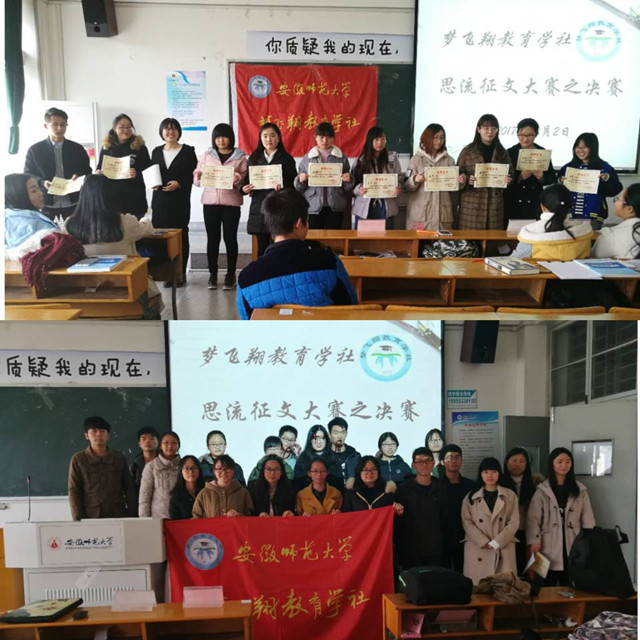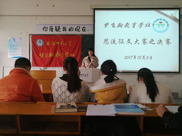 本网讯(教科院 李晓晨 龚伟)文章千古事,妙手偶得之。舍得青春,舍得思考;把握青春,把握现在。为进一步将教育话题说的有道理,写的有品位,为同学们提供一个分享教育故事,展示“思想”心得的平台,梦飞翔教育学社举办了首届“思流”杂志征文评选大赛。此次活动面向安徽师范大学全体在校本科生,由初赛,复赛,决赛三个环节组成,共历时13天。122日下午,决赛于田家炳教学楼8402教室举行。