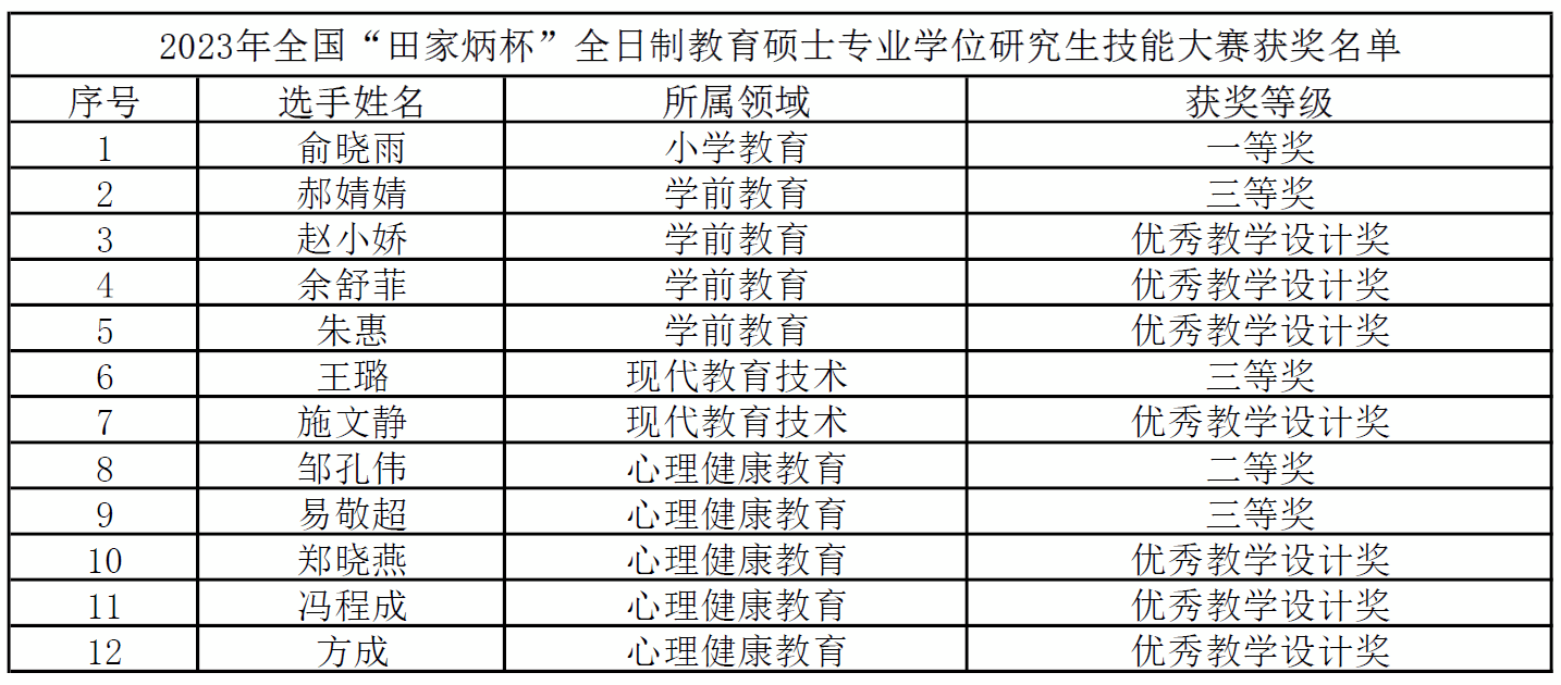近日,教科院顺利组织小学教育、学前教育、现代教育技术、心理健康教育共4个领域研究生参加了2023年全国“田家炳杯”全日制教育硕士专业学位研究生教学技能大赛。在校研究生院的指导下,经过初赛选拔和决赛的激烈角逐,教科学子最终斩获一等奖1项、二等奖1项、三等奖3项、优秀设计奖7项,徐赟、丁园园两位老师获“优秀指导教师”荣誉称号。