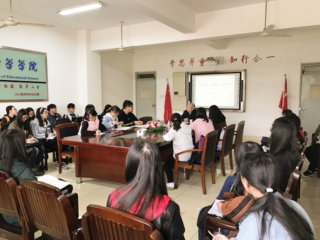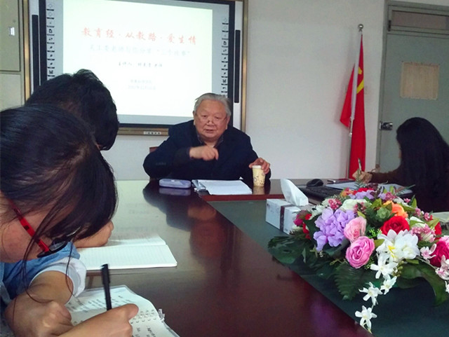 从教以来,杨老师一直在教育事业中勤勤恳恳,即便已是满头白发,依旧坚持为众多的莘莘学子答疑解惑,他这样感慨道: “一生教书,平平淡淡,无怨无悔,与生共处,人生充实,我热爱我的职业,我的教育事业。”学识渊博的杨老师引用古文“传道”、“授业”、“解惑”阐释了教师的职责所在,同时通过陶行知等教育家名言教导在座同学作为一名老师,是万千学子的榜样,我们首先应乐于从教,热爱教育事业,同时在教人的过程中要不断学习知识,提高自己;学会做学问,提高自身科研能力;不断净化自己,学会与人相处,强调自化才能化人,做到以人教人,立德树人。