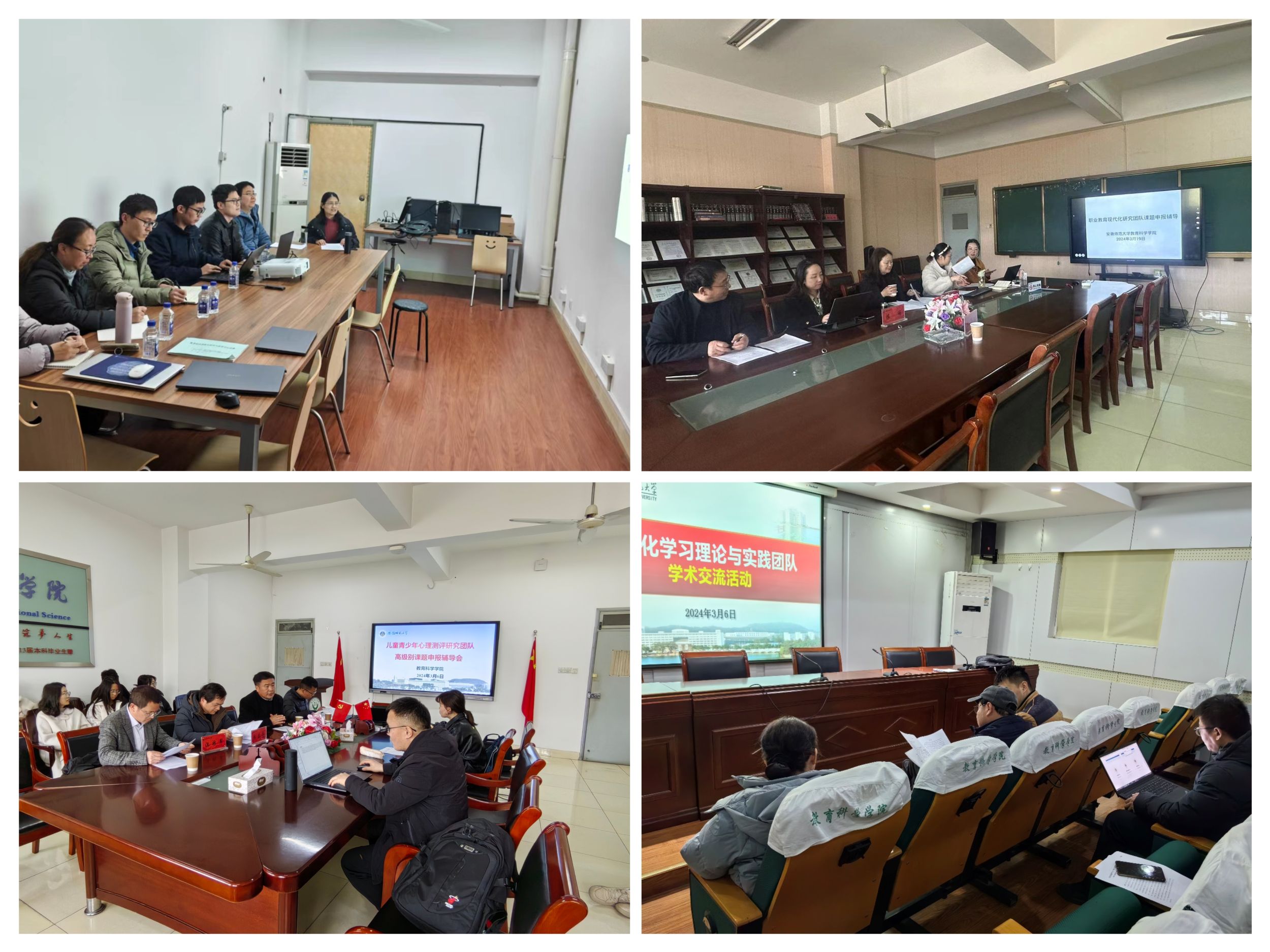 安徽省教育治理现代化科研创新团队、认知与研究发展团队、大课程大教学大学习构建与发展研究团队、中国式职业教育现代化研究团队、儿童青少年心理测评研究团队、大数据教育评价与数字教育资源供给研究团队、情绪与健康心理学研究团队等7支团队的辅导会上,有经验的老教师耐心为申报教师答疑解惑,提出具体的建设性建议。路宝利教授、赵必华教授、刘和海教师负责的团队还分别邀请了河海大学汪祚军教授、赣南师范大学郑显亮教授、华东师范大学孙玫璐副教授、扬州大学冯锐教授等校外专家线下辅导,面对面对青年教师课题申报书中的问题进行精准的点评与辅导,提出了很多针对性的建议和意见。
