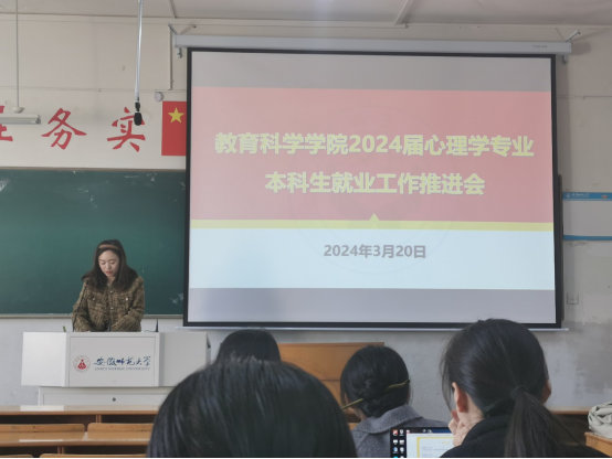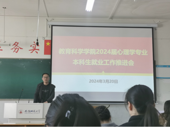 为进一步促进2024届心理学专业本科生充分高质量就业,了解心理学专业毕业生求职动态,3月20日下午,学院在田楼8201教室召开教育科学学院2024届心理学专业本科生就业工作推进会。学院党委副书记杜凤、专业负责人王礼军、辅导员蔡文参加会议,会议由辅导员蔡文主持。