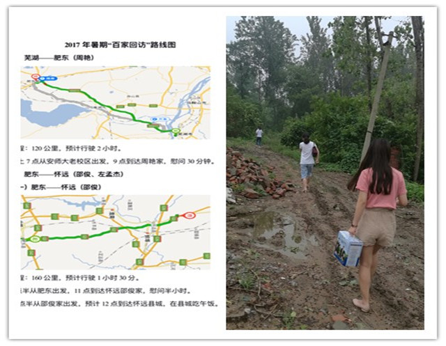 (教科院 朱雨雁 莫大贡)为贯彻落实国家资助政策和学校有关家庭经济困难学生资助的文件精神,开展暑期“百家回访”工作,同时也为了进一步了解家庭经济困难学生家庭经济真实状况及学生受助后的学习生活情况,教科院成立以学院党政领导为组长,专兼职辅导员为组员的回访小组,8月7日至8日期间,工作组陆续开展合肥、蚌埠、亳州、阜阳、安庆等地的贫困生回访工作。