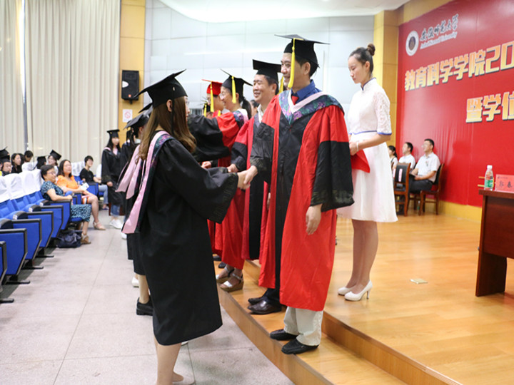 一场盛典,满满仪式只为成就最美记忆。绚丽的签名墙、喜庆的幕布、院长大人亲自手写的祝福语,无不渗透着学院对毕业生的殷殷关切;每一个学生身着学士服、每一位导师身穿导师服、每一个嘉宾身配小胸花,无不饱含着学院对学生顺利毕业的深深欢喜;院旗的交接、院友的祝福、校歌的吟唱,无不彰显着师大精神的传承。鞠躬、握手、拨穗、颁证、合影,每一个流程无不显现着毕业的庄重与神圣。让每一个毕业生成为典礼的主人,让每一位教师感受教书育人的幸福,让每一个家长分享孩子成长的喜悦,让每一个社会人士见证我们学子的优秀,教科始终在努力。