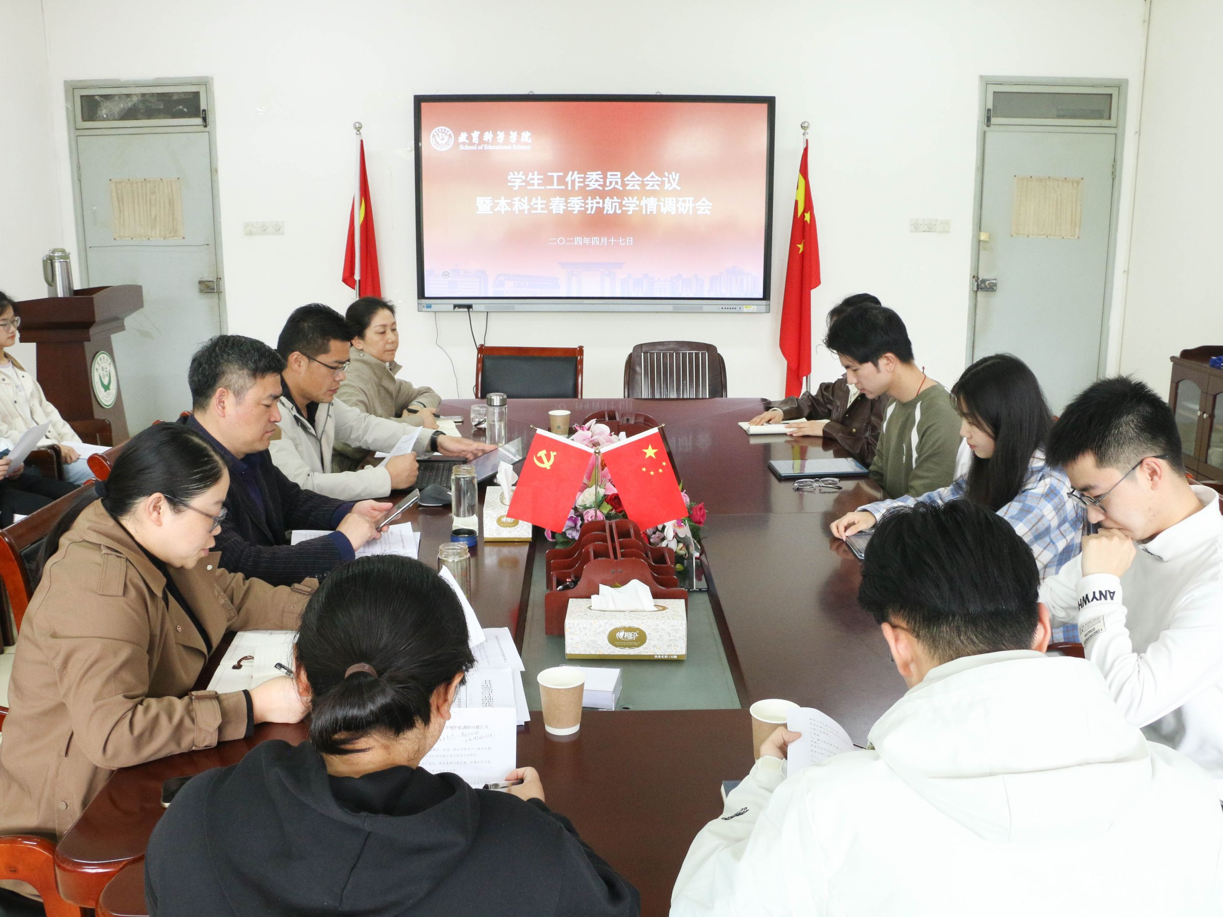 为扎实推进时代新人铸魂工程,全面落实大学生护航行动计划,4月17日下午,教育科学学院于田楼B座308会议室召开学生工作委员会会议暨本科生春季护航学情调研会。学院学生工作委员会教工委员与学生委员参加,会议由院党委副书记杜凤主持。