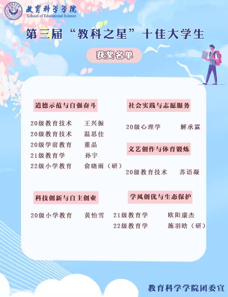 时代殷殷嘱托,青年砥砺前行。“教科之星”十佳大学生评选是学院为教科学子搭建的分享交流平台,秉持树立先进模范、发挥榜样引领作用的理念,旨在促进学生的全面发展。希望更多的教科学子向榜样学习,用奋斗书写青春的精彩篇章。
