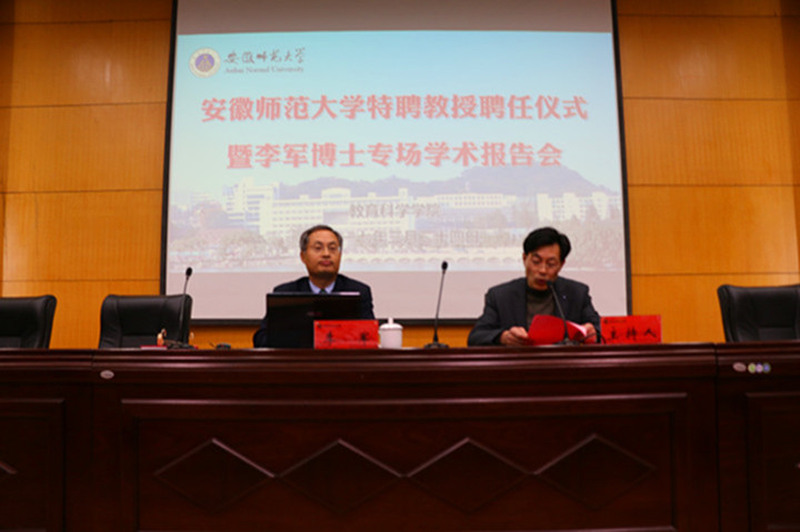 讲座伊始,桑青松代表学院对优秀院友李军的到来表示热烈欢迎,校人事处处长朱为民亲临现场为李军颁发安徽师范大学特聘教授证书。李军博士对此表示感谢,同时对母校安徽师范大学也表示了崇高的敬意,他在深情回忆起母校求学的经历时,反复感叹“回家真好”,情到深处不禁落泪,感人至深。