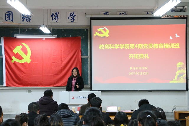 本网讯(教科院 范晨晨 裴扬 莫大贡)为解决毕业班党员教育培训面临的难题,我院第四期党员教育培训班在2016年慕课教学模式基础上,积极探索“课堂派”教学新模式。本期培训班于3月22日下午在田楼8101正式开班。院党委书记刘晓宇,院党委副书记张如华,分党校班主任莫大贡、副班主任随小莉以及来自本科生和研究生的81名学员参加了开班典礼。典礼由随小莉主持。