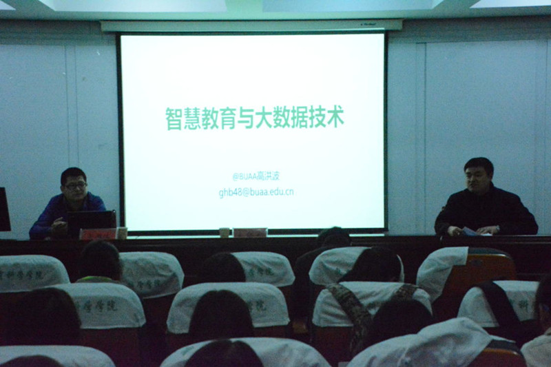 本网讯(教科院)2017年1月2日晚,北京航空航天大学高洪波博士在学院三楼学术交流中心,作题为《智慧教育与大数据技术》的学术报告。报告会由李宜江副院长主持,我院桑青松院长、相关专业教师以及教育技术学本科生与研究生到会聆听。