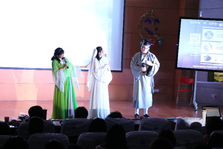 晚会温馨动人,师生共乐。吴玲老师一曲《南屏晚钟》将我们带回了上世纪的温婉动人音乐之中,何元庆老师、全丽娟老师携学生带来一首《心念》诗歌朗诵以及歌曲串烧。两位老师团队带领的心理学沙龙,让我们看到学术在左,成长在右,有才有爱有情怀的深厚师生情谊以及浓厚的学术氛围。小品《拆弹夫妻》、《新白娘子传奇》表演者妙语连珠,诙谐的语言、经典的另类讲述都让现场观众们拍手叫绝,现场的欢笑声与掌声一直伴随着节目的进行,晚会的气氛被推向了顶峰。