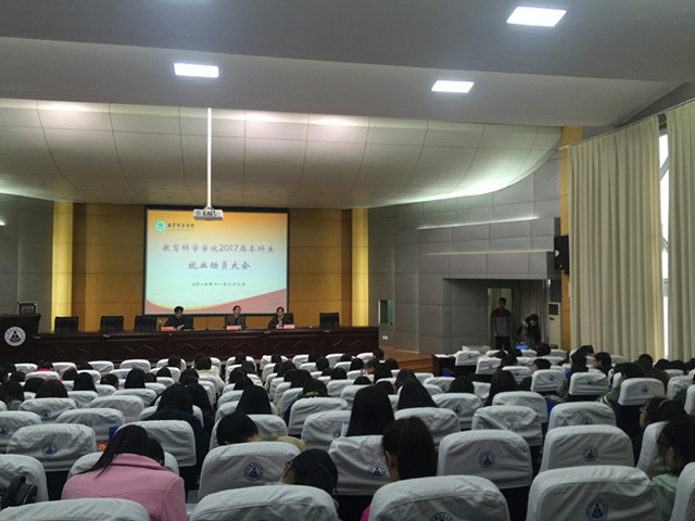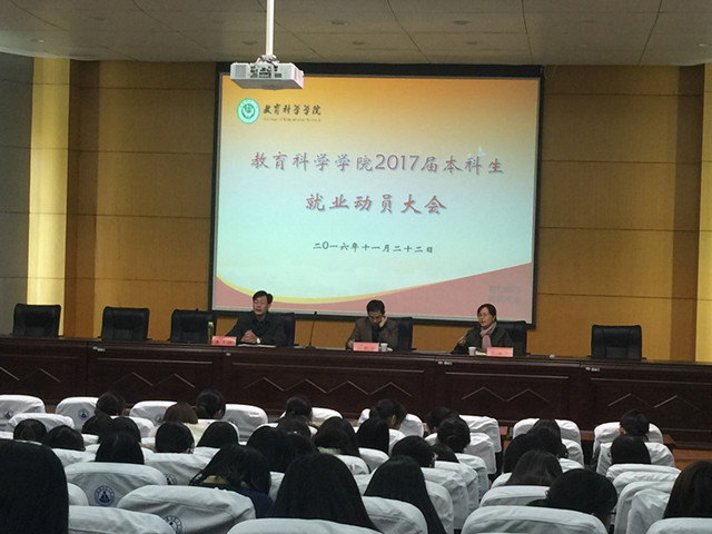本网讯(教科院 马兴)你的未来,我们助航。11月22日下午,教科院在田家炳报告厅开展了一系列活动推进2017届毕业生就业。院党委书记刘晓宇、院长桑青松、科研副院长聂竹明出席了本次会议,毕业班辅导员马兴、2017届全体本科毕业生参加此次大会。会议由学院党委副书记张如华主持。