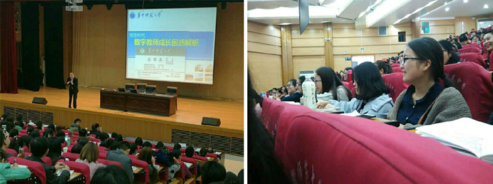 本网讯(教科院 苗艳侠)近年来,我院十分重视各专业与教育实践基地之间的协作与交流,不断探索育人新模式,积极组织开展形式多样的教育研究与人才培养活动。11月5日上午,在教育技术学专业与安师大附中精心协调与组织下,由刘和海、吴文涛老师领队,教育技术学专业15级、16级研究生以及15级全体本科生,参加了芜湖市教育局主办的“2016年芜湖市教育局直属学校骨干教师信息技术应用能力培训”活动之专家报告会。师生们集体聆听了我国知名教育技术学专家,华中师范大学博士生导师吴军其教授的“数字教师成长困惑解析”的专题报告。