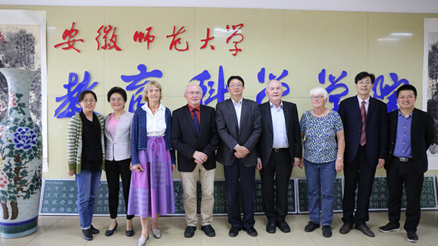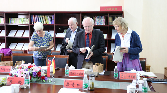 王伦校长代表学校对客人的到来表示热烈欢迎,并介绍了我校的基本情况,特别是教科院在教师教育研究方面取得的成果。他指出,自希尔伯特·迈尔教授在2006年受聘为安徽师范大学客座教授以来,双方为未来间学术交流创设了很好的条件,两校具有良好的合作基础;中德两国教育的差异性以及各自的丰富经验,更应多在学术交流中体现,他诚挚邀请对方学校校长来我校交流访问,为我校高水平大学建设发展多提宝贵意见。希尔伯特·迈尔教授一行也衷心希望,此次访问可以作为两校紧密合作新的契机,在平等、互助、共同发展的前提下,除进一步加强教师交流的合作以外,期待未来两校的合作进一步深化,期待更多年轻教师参与中德教育对话,希望双方互派教师交流访学,以期在国际交流方面取得更加卓越的成果。桑青松代表学院表达了欢迎和感谢之情,他期望双方在人才培养模式、教师教育改革和课程教学改革等方面继续推进教育国际化,为学院学科发展和内涵建设发挥重要作用。期间,王伦校长与希尔伯特·迈尔教授互赠礼物,桑青松代表学院将《教育科学学院院史》赠送对方,最后合影留念。