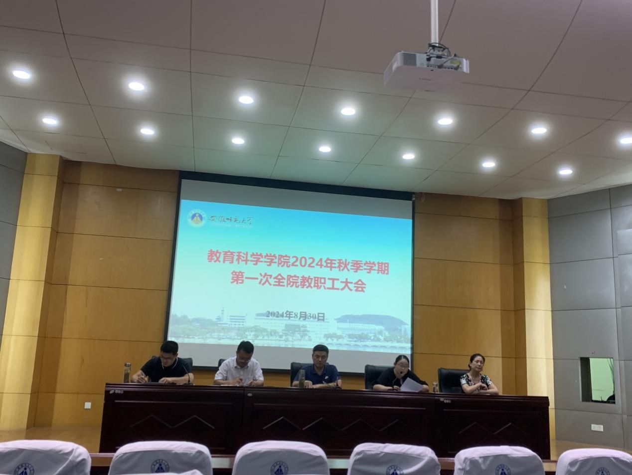 为深入学习贯彻党的二十届三中全会精神,加强政治理论学习,8月30日下午,教育科学学院召开教职工政治理论学习大会。会议由院长李宜江主持,全院教职工参加会议。