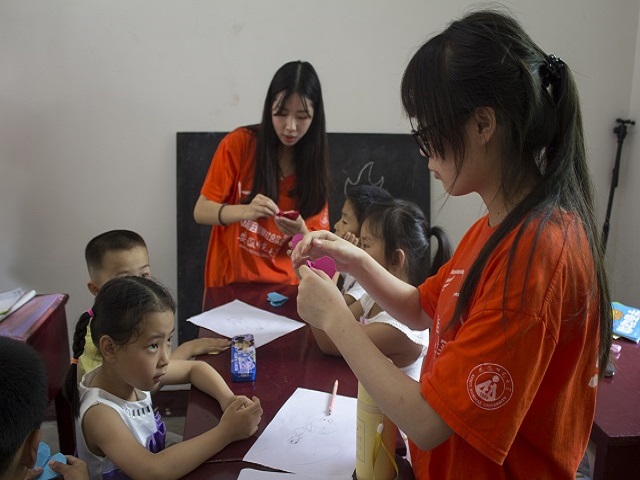早上九点整,在完成日常的课业辅导以后,队员们给低年级的孩子们安排了手工折纸课,每个孩子都折得很认真。经过队员们的耐心示范与讲解,一个个纸折的爱心就这样在他们手中出现。看到他们学会折爱心后露出的灿烂笑容,队员们感到十分欣慰。