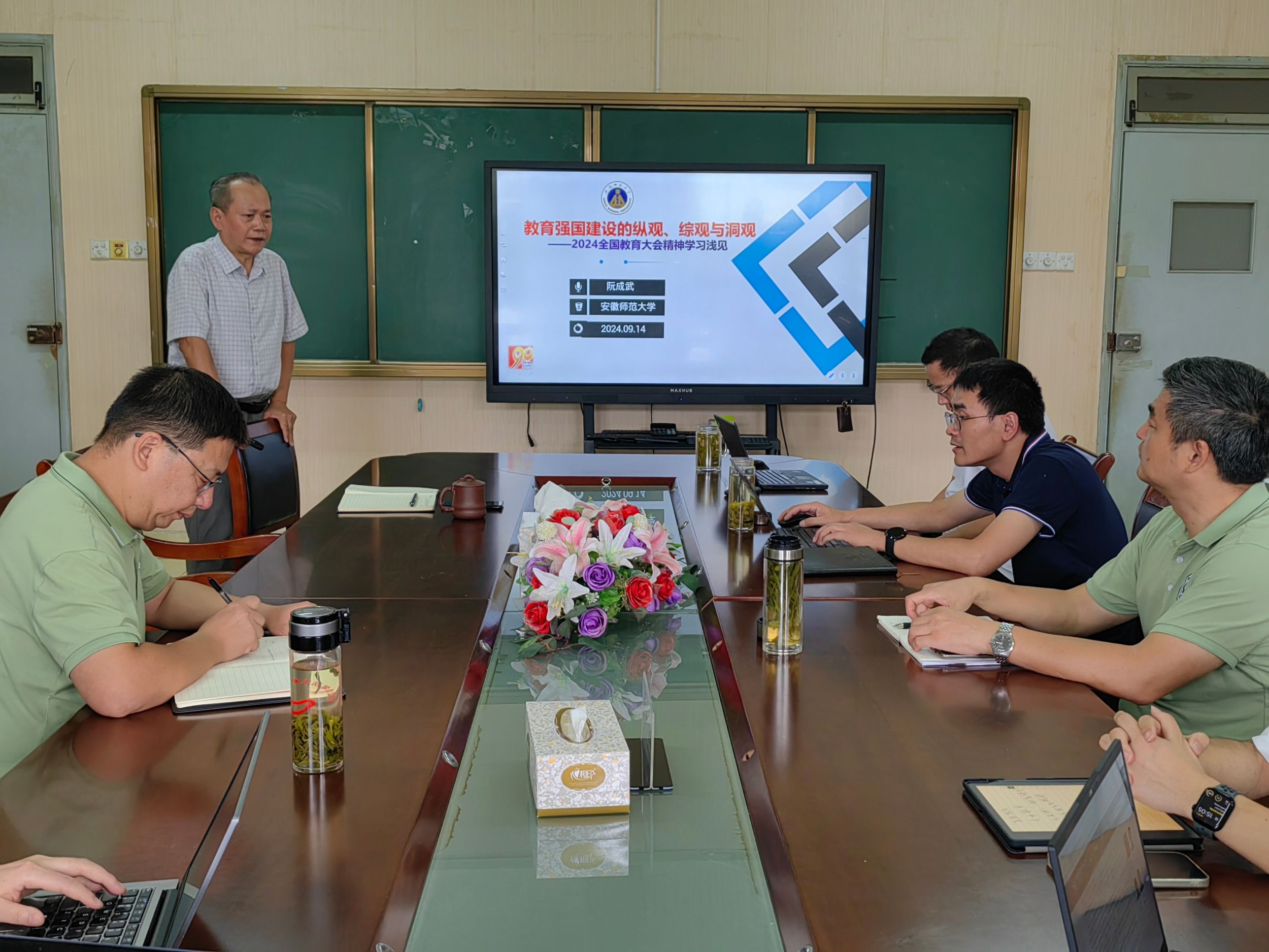 阮成武教授对新中国成立以来已召开的六次全国教育大会进行了系统梳理,并就我国加强教育强国建设的任务与挑战、这次全国教育大会关于教育强国建设的战略部署等方面进行了阐释。与会师生分别围绕教学、科研、学业等方面,交流了学习体会。大家纷纷表示,全国教育大会引出了许多教育研究新课题,为广大教育工作者提供了广阔的研究空间。李宜江鼓励大家,要深入学习贯彻全国教育大会精神,紧紧围绕立德树人这个根本任务,把自己的学术研究与教育强国建设紧密结合起来,弘扬教育家精神,培养德智体美劳全面发展的社会主义建设者和接班人。