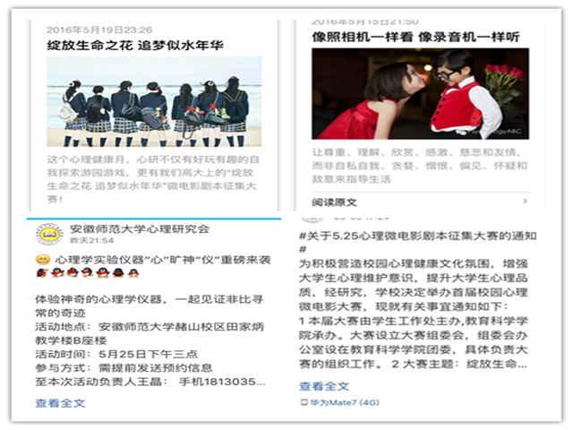 本网讯(教科院 万璇 龚伟)点滴热情,汇聚心灵。为丰富校园生活,营造和谐的校园心理氛围,促进师大学子心理健康发展水平的提高,提高学生关爱自我、了解自我、接纳自我、关注自我的品质,安徽师范大学心理研究会在5月25日到来之际举办了多场活动,进一步引导我校大学生认识自己,提高自身心理素质。