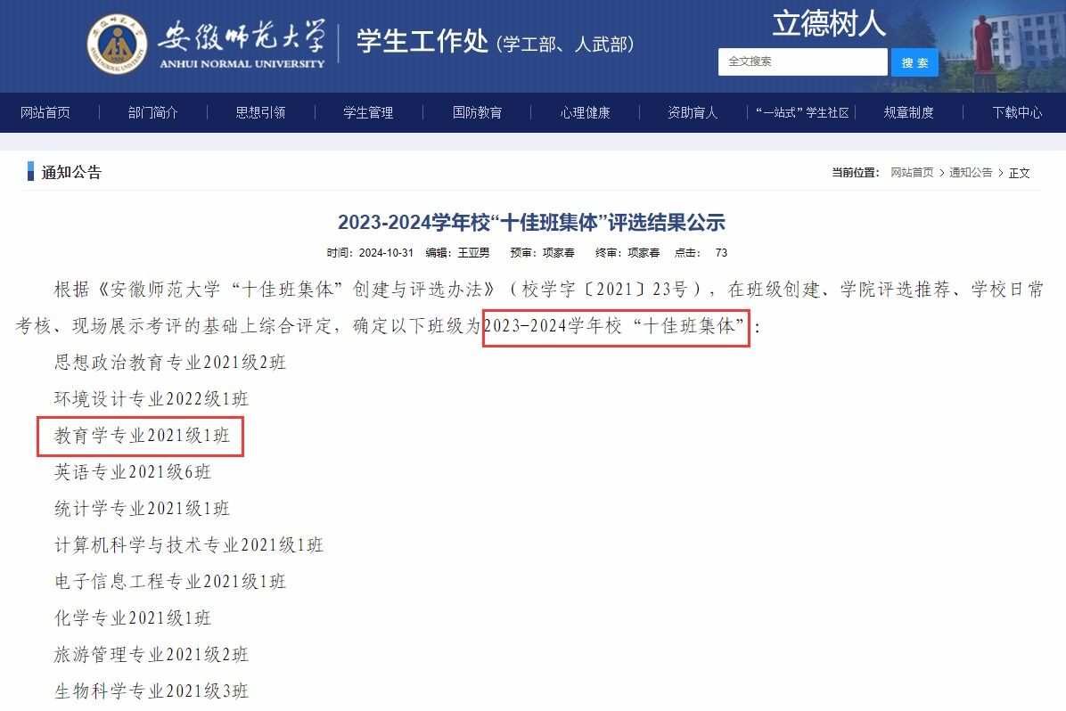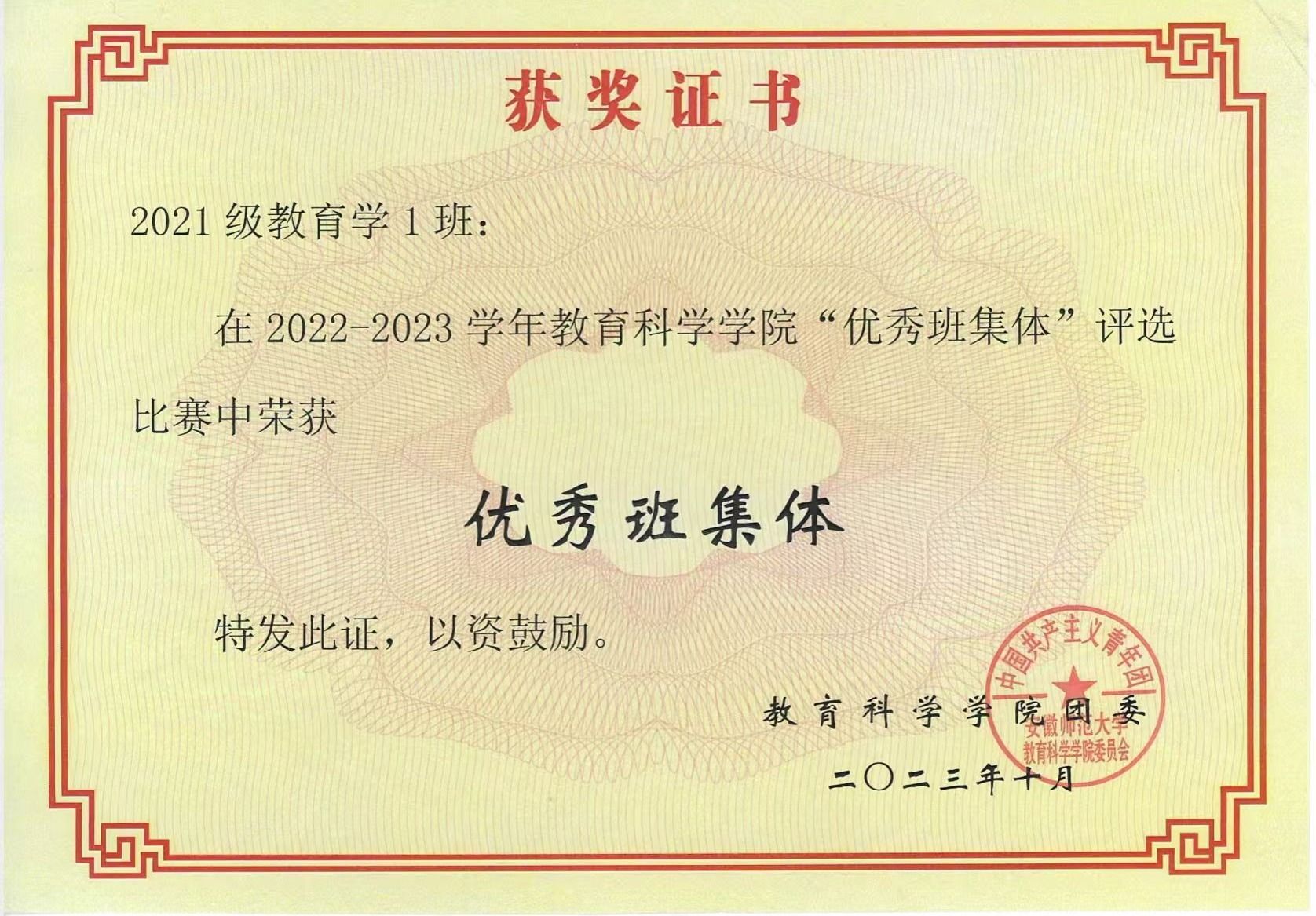 10月30日下午,安徽师范大学2023-2024学年“十佳班集体”风采展评会在花津校区举行。教育科学学院2021级教育学1班在本次“十佳班集体”评选中以精彩的表现脱颖而出,荣获“十佳班集体”荣誉称号。该班也是继2023年2020级教育技术学1班之后,学院再次获评校“十佳班集体”的班级。