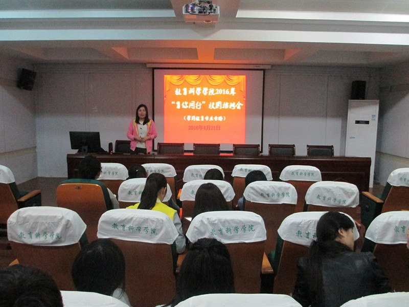 4月21日上午,学院邀请金色阳光(香港)教育集团和北京红缨幼教集团,在三楼学术交流中心举办“育你同行”学前教育专场招聘会,毕业班辅导员孟庆娟主持了招聘会。金色阳光(香港)教育集团下属的芜湖县贝高幼儿园、上海市浦东区永卓幼儿园负责人分别详细介绍了该教育集团的发展状况、教学特色、办园理念、园所设施以及发展规划。北京红缨幼教集团教学督导闻银燕从红缨幼教集团创始人的故事入手,向毕业生们介绍了红缨幼教集团的发展情况。据悉,该集团作为中国最大幼儿园连锁机构,目前在全国31个省份拥有1500多家连锁幼儿园,安徽连锁幼儿园已达60家,今年下半年拟在芜湖金域华府建成优质幼儿园。两家教育集团的负责人均表示,集团内部选择机会多,发展空间大,毕业生们可以根据需要选择工作园所的地址。招聘会尾声,毕业生们和招聘单位进行了更深入的交流,招聘单位针对大家提出的问题进行了详细解答,毕业生们也纷纷投上了精心准备的简历。面试环节中,学前教育专业同学表现出了扎实的专业素养和较高的综合素质,得到用人单位的一致认可。这两场招聘会效果明显,多名同学现场达成初步就业意向。