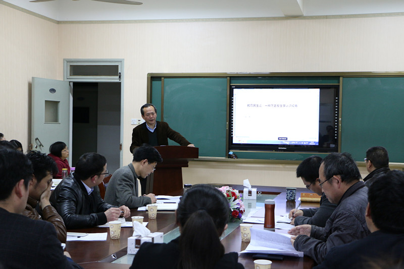 随后,学术活动月正式开讲,我院青年教师徐赟博士和阮成武教授分别做学术交流报告。第一场报告由周兴国教授主持,主讲人是徐赟博士。徐博士结合自己的博士论文,做了题为《教育政策与教育实践关系的理论与现实问题研究》的报告。该报告从几个案例出发,揭示了当前我国教育政策并非全部对教育实践产生有效变革的现实问题,指出该问题上的理论困难;提出研究教育政策与教育关系的问题。进而,在重新厘定教育政策与教育实践内涵与外延的基础上,从历史与逻辑的角度分别论证了教育政策与教育实践之间的互动关系,提出教育政策与教育关系的本质——教育政策与教育实践双向对象化,重新构建了中国特色的教育政策活动过程——教育政策是在不同的实践层面逐渐形成的多层级的“决策——反馈——调整”的循环链条。徐博士报告问题鲜明,各部分研究之间逻辑性较强,容量较大并且系统、深入。戴兆国教授、尹建锋博士、葛明贵教授、周兴国教授、李宜江教授分别就相关问题与徐赟博士进行了讨论与交流。