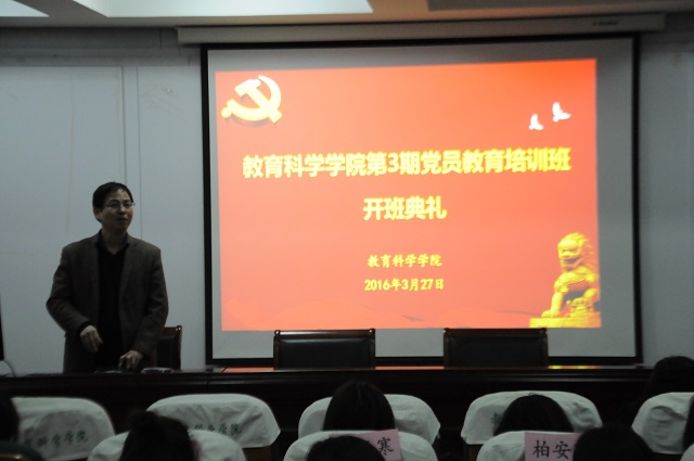 本网讯(教科院 李书婷)3月27日上午9点,教科院第3期党员教育培训班正式开班。院党委书记刘晓宇、副书记张如华以及来自学院各专业的本科生、研究生共77名学员参加本次开学典礼。开学典礼由培训班班主任莫大贡主持。
