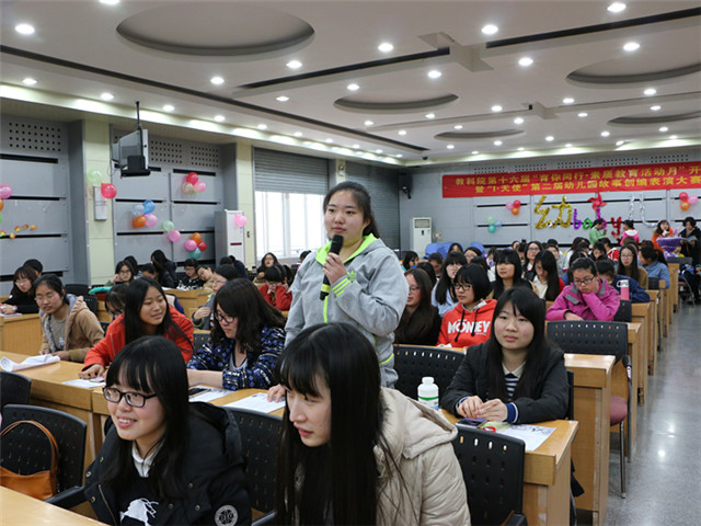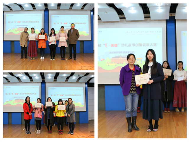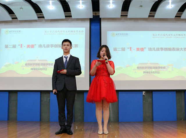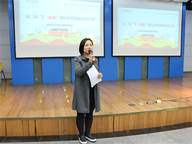 本网讯(教科院 吴素婷)故事伴随每个人的成长,故事赋予每个人生活的希望,每一个童年故事都有着一份特殊的意义。为响应校第23届大学生文化体育艺节的号召,开展富有特色的团学活动,3月27日下午,教科院第二届“I·天使”幼儿故事创编表演大赛在赭山校区就业报告厅隆重举行,与此同时,学院第十六届“育你同行·素质教育活动月”也藉此活动正式拉开帷幕。芜湖市幼儿舞蹈创编最佳编导,舞蹈家协会理事杨春燕,芜湖市附幼语言组组长笪敏,学院党委副书记张如华,学前教育专业负责人张更立、学前教育专业教授吴玲担任了此次大赛的评委。各年级学前教育专业学生以及其它专业的部分学生共同观摩了此次比赛。