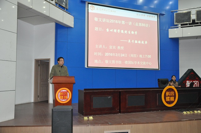 本网讯  3月24日晚,敬文讲坛2016年第一讲(总第86讲)在敬文图书馆一楼国际学术交流中心如期开讲。讲坛邀请到我院心理学专业宣宾教授,做了题为“当心理学遇到生物学——关于脑的故事”的专题讲座,讲座由图书馆馆长方青教授主持。图书馆党总支书记程文海和广大师生一起聆听了本次讲座。