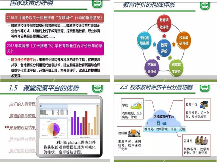 朱教授首先提出了四个开放性问题来引发大家思考:您认为信息技术能够撬动教育评价的变革吗?数字化教育评价的喜与忧是什么?数字化教育评价的触角到底伸向哪里?大数据技术到底如何服务于教育评价?朱雪梅指出,要解决好这些问题,必须相信教育技术能够变革教育评价。近年来,国家政策多次提出要探索教育信息化应用的新模式,特别是2013年教育部文件《关于推进中小学教育质量综合评价改革的意见》指出:要建立评价的资源平台,建议组织专业机构开发科学的评价工具,促进资源共享,各地要充分利用现代信息技术,建立和完善综合评价的数字化管理平台,开发评价工具,为开展评价、改进工作提供技术的支撑。朱教授表示,围绕这个主题,十多年来做了两个方面的探索:一个是“互联网+”课堂教学观察,一个是“互联网+”校本教研的评估。