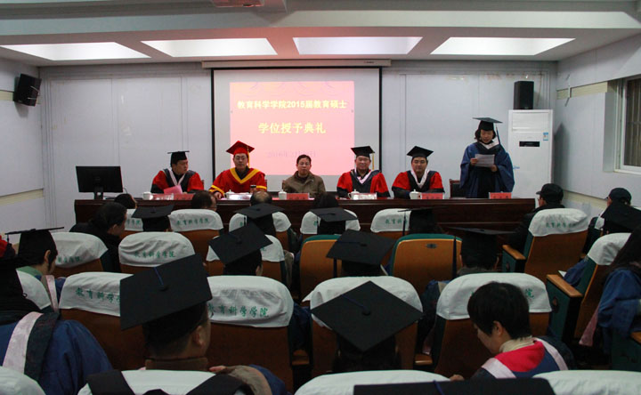 本网讯(教科院研究生  任太平)2月28日上午,我院2015届教育硕士暨同等学力学位授予仪式在院三楼学术报告厅隆重举行。学院党委书记刘晓宇、院长桑青松教授、副院长李宜江教授,院教授委员会主任周兴国教授,导师代表以及2015届教育硕士、同等学力研究生参加大会,大会由副院长聂竹明主持。