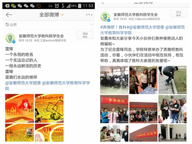 除展板宣传外,学院团委学生会也通过微博平台加强线上互动,不仅展示了近期学院开展的各项“雷锋日”主题活动,还与广大师生互动交流,此项活动受到了大家的热烈追捧,同学们参与活动、热议雷锋,共享雷锋文化,传承雷锋精神。