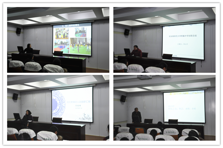 随后,在安师大附幼挂职实践的葛燕老师、李晓博老师;在附属中学挂职实践的金维才老师、李小平老师分别就挂职实践过程中开展的各项工作做了全面汇报,并结合各自挂职过程中遇到的教育问题进行了深刻的思考,有感悟、有收获,也有不足。同时挂职教师也为学院此项工作的深入推进提出了一些好的建议。挂职教师普遍认为,挂职实践能切实提高教师实践能力和业务素养,进一步发挥高校对基础教育的服务和引领功能,扎实推进学院内涵发展,彰显学院办学特色。