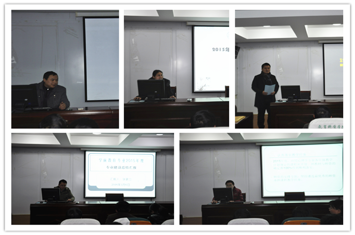 汇报会上,国家级特色专业建设点教育学专业负责人辛治洋教授从专业发展人才培养视角,强调对于学生的管理要从及时精确的入学辅导、规范有序的在学指导、心心相印的毕业就业等方面展开,并详细地展示了教育学专业在学生培养等方面取得的成绩,该专业将把进一步优化人才培养模式,注重学生的专业发展,打造特色品牌专业作为发展目标;心理学专业负责人宣宾教授、应用心理学专业负责人李小平副教授、学前教育专业负责人张更立副教授分别从专业人才培养、专业质量工程建设、师资队伍及专业特色方面进行了全面总结,同时也认真剖析了当前专业建设存在的主要问题并提出了解决问题的具体建议;教育技术学专业负责人聂竹明副教授表示,教育技术学专业在专业建设方面实现了“一年两跨越”,教学改革获得高度认可,中美合作项目推进顺利,未来将进一步创新人才培养制度,明确工作的方向和目标。