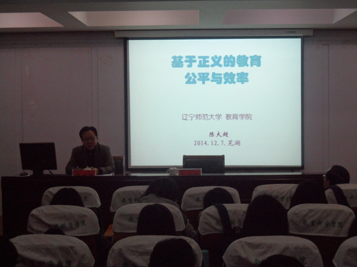 本网讯(研究生  邵晓/文  魏成成/图)12月7日上午,辽宁师范大学教育学院副院长、博士生导师陈大超教授在院三楼学术中心作题为“基于正义的教育公平与效率”报告,院教育学类本科生和研究生到会聆听。报告会由副院长阮成武教授主持。