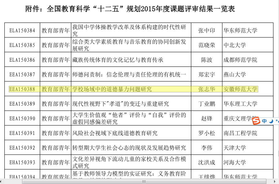 本网讯(教科院 孟庆娟)12月15日,全国教育科学规划领导小组办公室公布了全国教育科学“十二五”规划2015年度课题立项名单,我校共有1项课题立项,我院青年教师张志华博士《学校场域中的道德暴力问题研究》(EEA150388)获教育部青年项目立项。