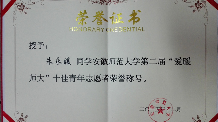 本网讯(研究生办公室)近日,我院15级教育技术学专业硕士研究生朱永媛同学被学校授予“‘爱暖师大’十佳青年志愿者”称号,成为全院第一位获此殊荣的在校研究生。